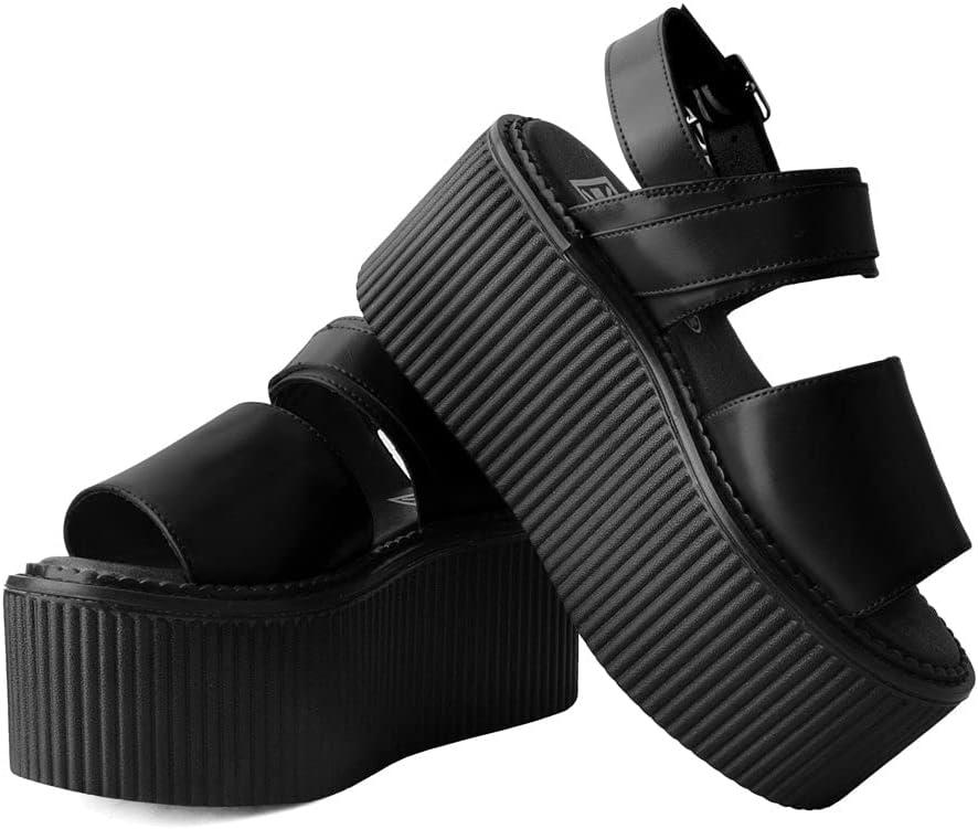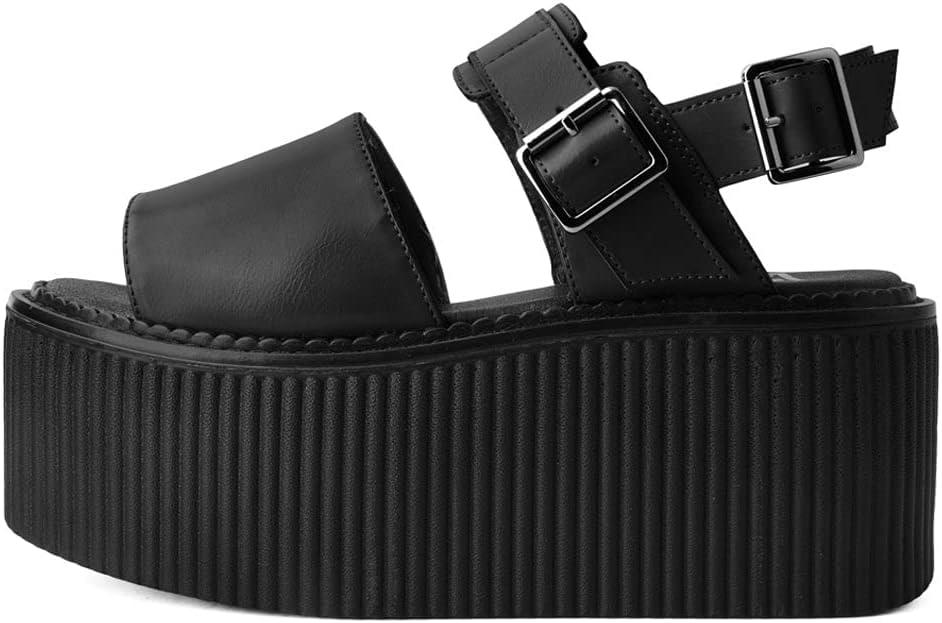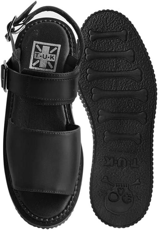 T.U.K. Black Brush-Off Stratocreeper Sandals are the perfect blend of bold style and everyday comfort. These vegan sandals have a unique brush-off PU upper that gives them a distinctive, edgy look. Built on the iconic VIVA stratocreeper sole, they provide a significant lift with a lightweight feel, making them a standout choice for your alternative fashion wardrobe. The design includes a secure ankle strap for a customized and comfortable fit. The platform measures approximately 3 inches at the heel and 2.5 inches in the front, providing impressive height without the discomfort of a steep incline. For added support, these sandals come with removable memory foam padding that you can adjust based on your needs. Why You’ll Love It: Standout style with a unique brush-off finish. Removable memory foam for personalized comfort. Lightweight platform for easy all-day wear. Secure ankle strap ensures a perfect fit. Versatile vegan design for various outfits. Step into confidence with these lightweight sandals. Ideal for those who love punk sandals and gothic sandals, these Stratocreeper Sandals provide a comfortable lift and a durable build, making them a practical and fashionable addition to your collection of women's fashion sandals.