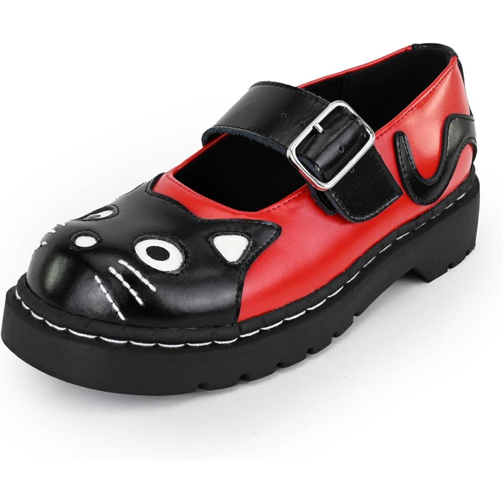 T.U.K. Kitty Cat Mary Jane Shoes for Women, Round Toe Ankle Strap Oxford Shoes(Red/Black)